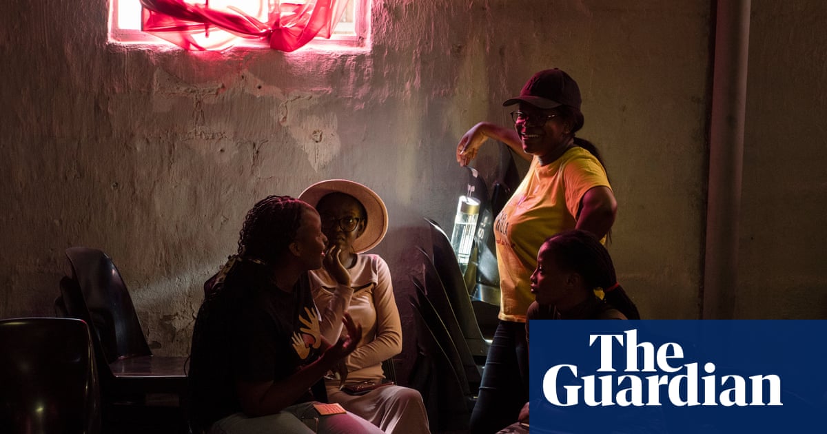 Red curtains and ceiling drapes create a pink-tinged glow inside the run-down community centre, an hour south of Johannesburg, where Palesa Hlohlolo tells her neighbours about her experiences of domestic violence.